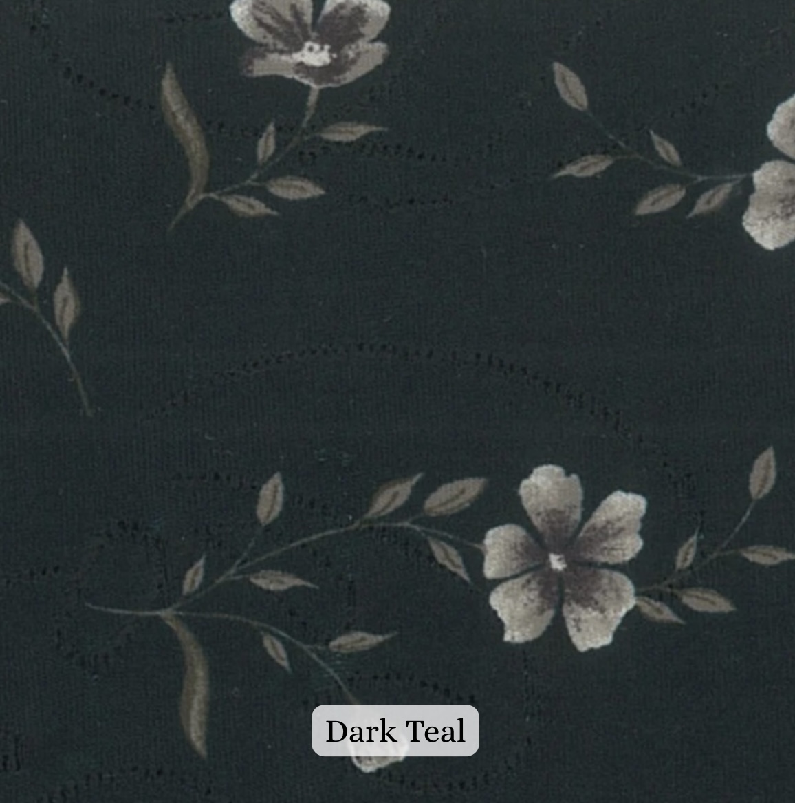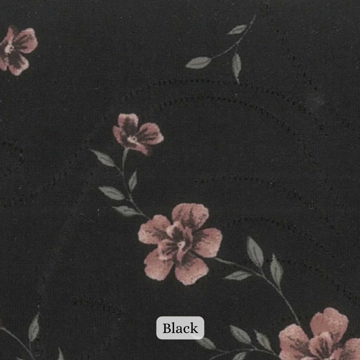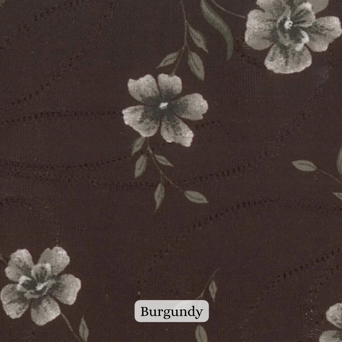 •This knit fabric has raised stitching in the background with a pleasant floral design.