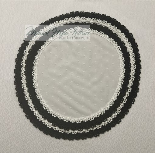 •Neatly edged in narrow lace trim, as shown.